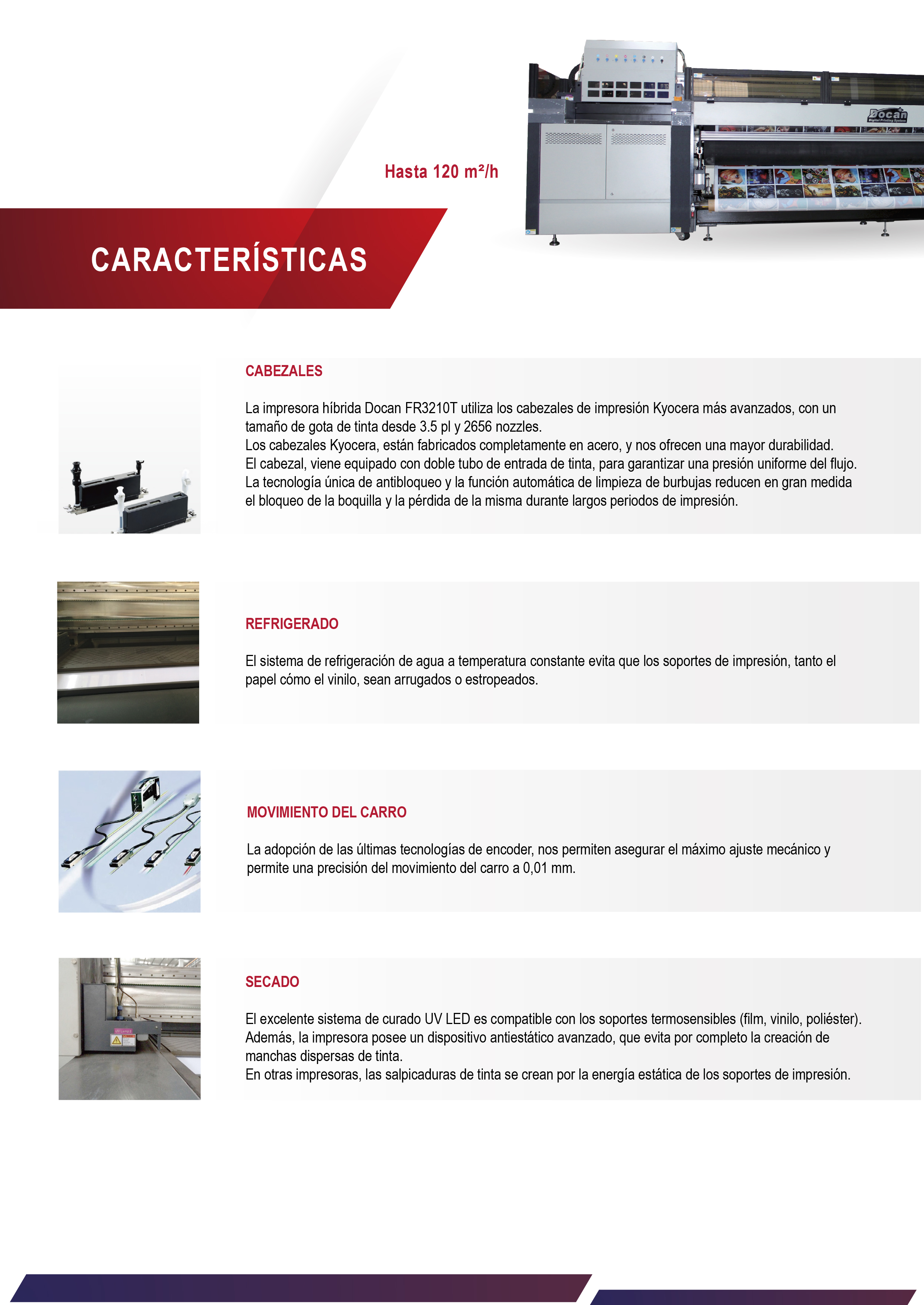 La impresora híbrida Docan FR3210T utiliza los cabezales de impresión Kyocera más avanzados, con un tamaño de gota de tinta desde 3.5 pl y 2656 nozzles.